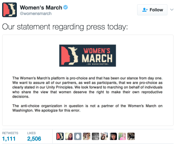 “The Women’s March’s platform is pro-choice and that has been our stance from day one. We want to assure all of our partners, as well as participants, that we are pro-choice as clearly stated in our Unity Principles. We look forward to marching on behalf of individuals who share the view that women deserve the right to make their own reproductive decisions. The anti-choice organization in question is not a partner of the Women’s March on Washington. We apologize for this error.”
