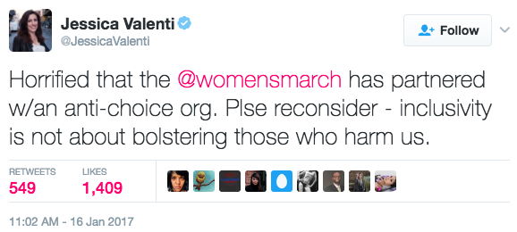 “Horrified that the @womensmarch has partnered w/an anti-choice org. Plse reconsider – inclusivity is not about bolstering those who harm us.”