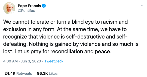 The full tweet reads, “We cannot tolerate or turn a blind eye to racism and exclusion in any form. At the same time, we have to recognize that violence is self-destructive and self-defeating. Nothing is gained by violence and so much is lost. Let us pray for reconciliation and peace.”
