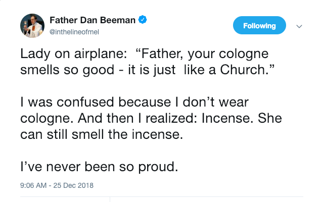 The tweet reads, “Lady on an airplane: Father, your cologne smells so good – it is just like a Church.” / I was confused because I don’t wear cologne. And then I realized: Incense. She can smell the incense. / I’ve never been so proud.”