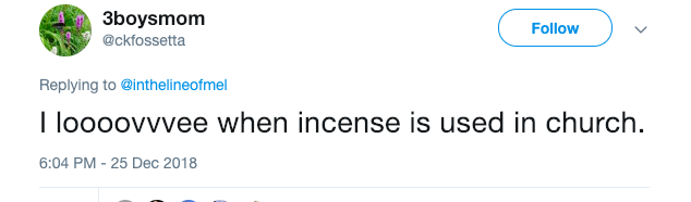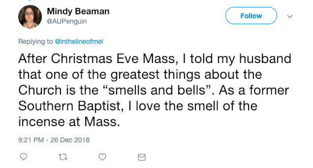 This user also responded, “After Christmas Eve Mass, I told my husband that one of the greatest things about the Church is the “smells and bells”. As a former Southern Baptist, I love the smell of the incense at Mass.”