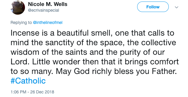 This user responded, “Incense is a beautiful smell, one that calls to mind the sanctity of the space, the collective wisdom of the saints and the purity of our Lord. Little wonder then that it brings comfort to so many. May God richly bless you Father. #Catholic”