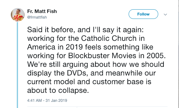 “Said it before, and I’ll say it again: working for the Catholic Church in America in 2019 feels something like working for Blockbuster Movies in 2005. We’re still arguing about how we should display the DVDs, and meanwhile our current model and customer base is about to collapse.