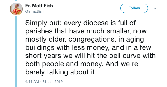 “Simply put: every diocese is full of parishes that have much smaller, now mostly older, congregations, in aging buildings with less money, and in a few short years we will hit the bell curve with both people and money. And we’re barely talking about it.