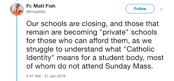 “Our schools are closing, and those that remain are becoming “private” schools for those who can afford them, as we struggle to understand what “Catholic Identity” means for a student body, most of whom do not attend Sunday Mass.