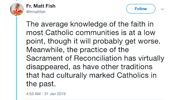 Fr. Matt Fish, the pastoral administrator at Holy Family Catholic Church in Hillcrest Heights, Maryland, wrote a detailed twitter thread describing reasoning for the “collapse” of the Catholic Church in America, or the West.