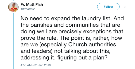 “No need to expand the laundry list. And the parishes and communities that are doing well are precisely exceptions that prove the rule. The point is, rather, how are we (especially Church authorities and leaders) not talking about this, addressing it, figuring out a plan?