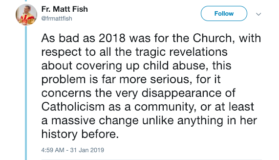 “As bad as 2018 was for the Church, with respect to all the tragic revelations about covering up child abuse, this problem is far more serious, for it concerns the very disappearance of Catholicism as a community, or at least a massive change unlike anything in her history before.