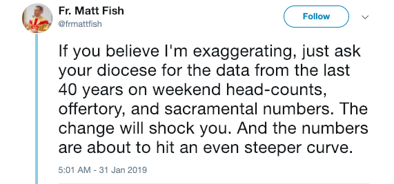 “If you believe I’m exaggerating, just ask your diocese for the data from the last 40 years on weekend head-counts, offertory, and sacramental numbers. The change will shock you. And the numbers are about to hit an even steeper curve.