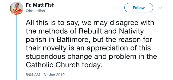 “All this is to say, we may disagree with the methods of Rebuilt and Nativity parish in Baltimore, but the reason for their novelty is an appreciation of this stupendous change and problem in the Catholic Church today.