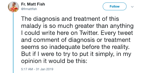 “The diagnosis and treatment of this malady is so much greater than anything I could write here on Twitter. Every tweet and comment of diagnosis or treatment seems so inadequate before the reality. But if I were to try to put it simply, in my opinion it would be this: