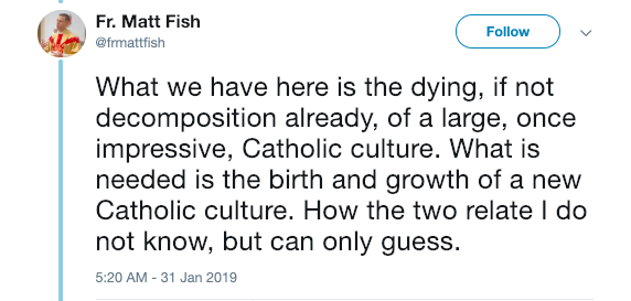 Fr. Fish also posted a follow-up thread, explaining that “despite immanent collapse of a passing Catholic culture, I have never seen so many signs of hope.” Read his full follow-up thread here.