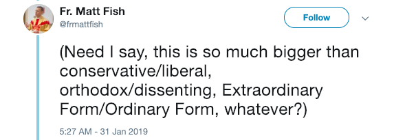 “(Need I say, this is so much bigger than conservative/liberal, orthodox/dissenting, Extraordinary Form/Ordinary Form, whatever?)”