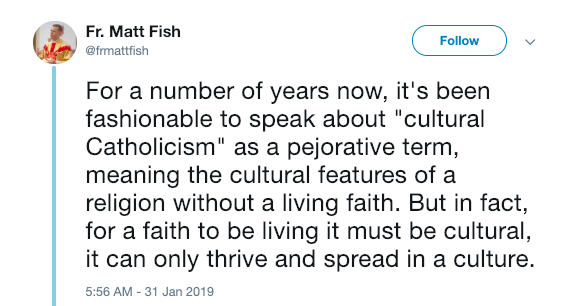 “For a number of years now, it’s been fashionable to speak about “cultural Catholicism” as a pejorative term, meaning the cultural features of a religion without a living faith. But in fact, for a faith to be living it must be cultural, it can only thrive and spread in a culture.