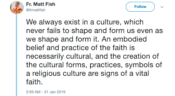 “We always exist in a culture, which never fails to shape and form us even as we shape and form it. An embodied belief and practice of the faith is necessarily cultural, and the creation of the cultural forms, practices, symbols of a religious culture are signs of a vital faith.
