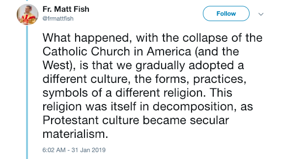 “What happened, with the collapse of the Catholic Church in America (and the West), is that we gradually adopted a different culture, the forms, practices, symbols of a different religion. This religion was itself in decomposition, as Protestant culture became secular materialism.