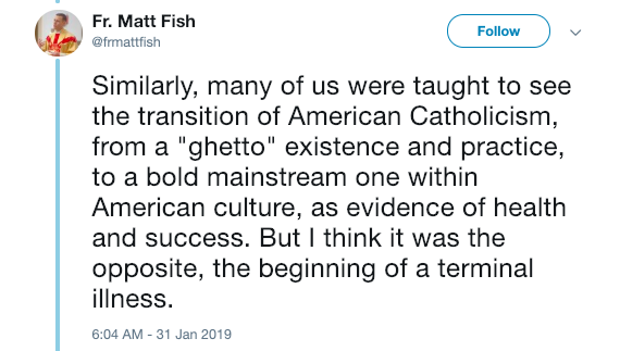 “Similarly, many of us were taught to see the transition of American Catholicism, from a “ghetto” existence and practice, to a bold mainstream one within American culture, as evidence of health and success. But I think it was the opposite, the beginning of a terminal illness.