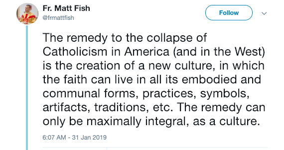 “The remedy to the collapse of Catholicism in America (and in the West) is the creation of a new culture, in which the faith can live in all its embodied and communal forms, practices, symbols, artifacts, traditions, etc. The remedy can only be maximally integral, as a culture.