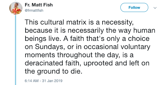 “This cultural matrix is a necessity, because it is necessarily the way human beings live. A faith that’s only a choice on Sundays, or in occasional voluntary moments throughout the day, is a deracinated faith, uprooted and left on the ground to die.