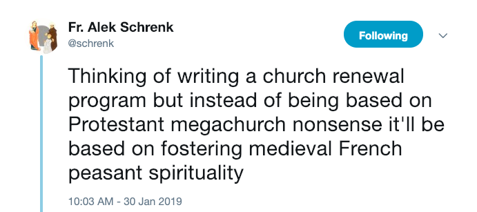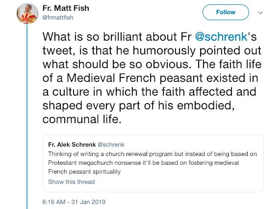 “What is so brilliant about Fr. @schrenk’s tweet, is that he humorously pointed out what should be so obvious. The faith life of a Medieval French peasant existed in a culture in which the faith affected and shaped every part of his embodied, communal life.