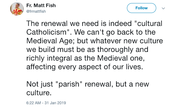 “The renewal we need is indeed “cultural Catholicism”. We can’t go back to the Medieval Age; but whatever new culture we build must be as thoroughly and richly integral as the Medieval one, affecting every aspect of our lives. Not just “parish” renewal, but a new culture.”